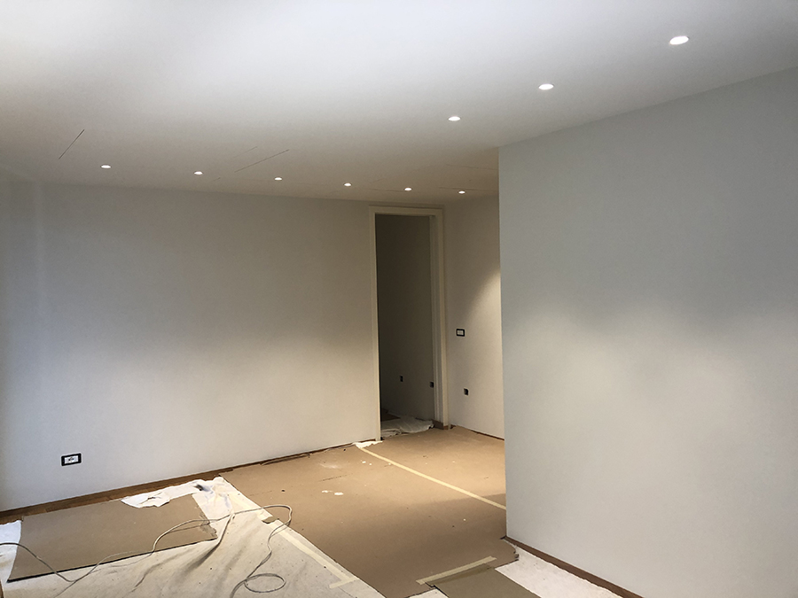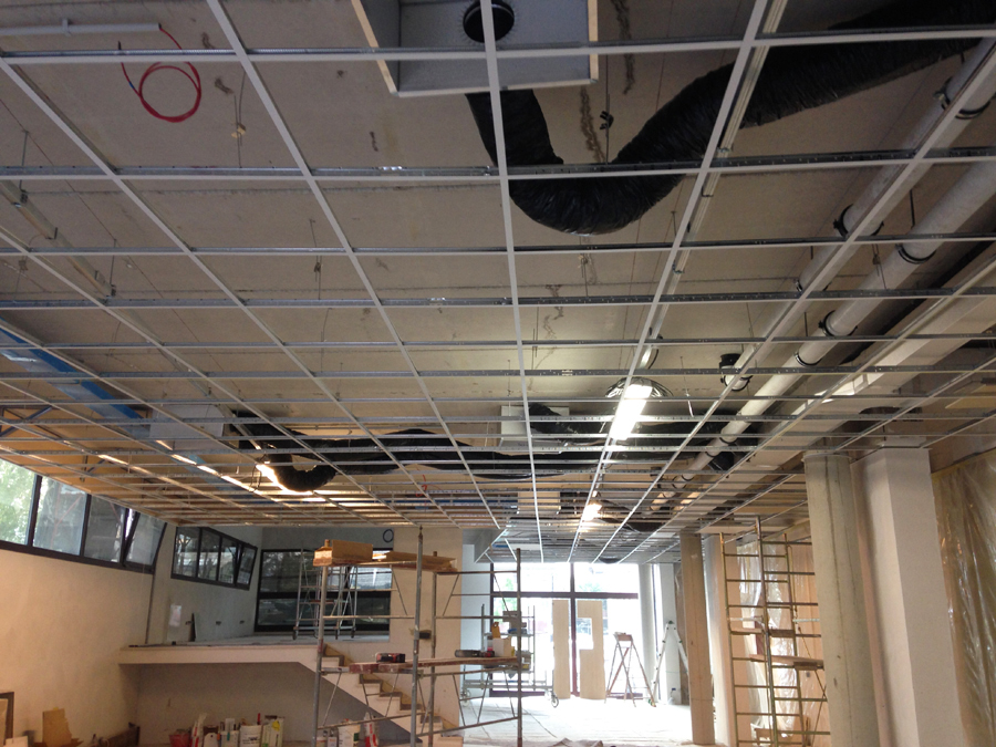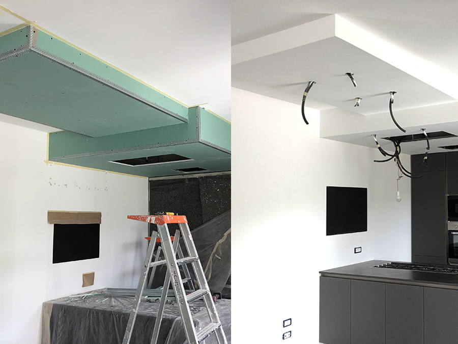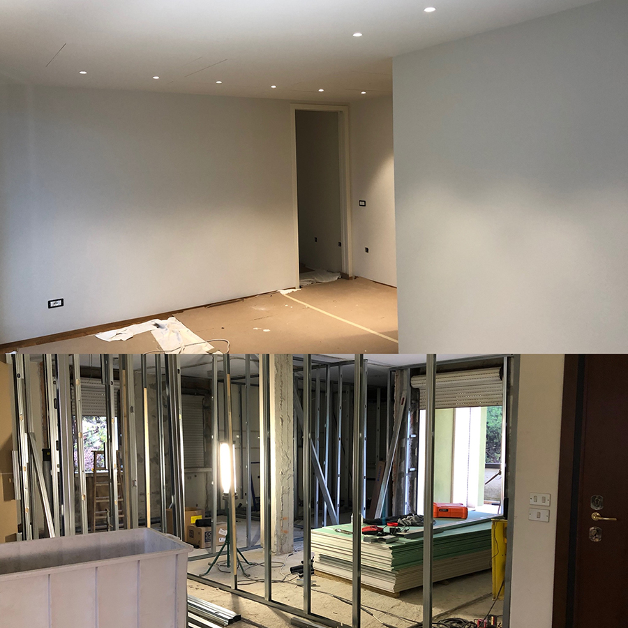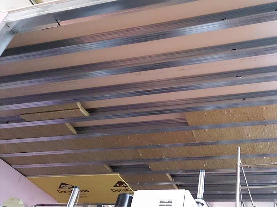 Montaggio controsoffitti e pareti in cartongesso, isolamento termo-acustico di pareti e soffitti, montaggio faretti e collegamento elettrico, montaggio porte a filo muro, certificazione per montaggio cartongesso in classe REI, controsoffitti in fibra minerale e metallici.
